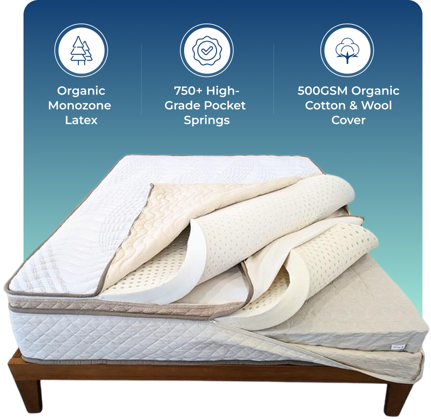 | Materials | Organic Latex, Cotton & Wool + Pocket Springs | Polyfoams (Plastic) or Innersprings | Natural Latex, Cotton & Bamboo |